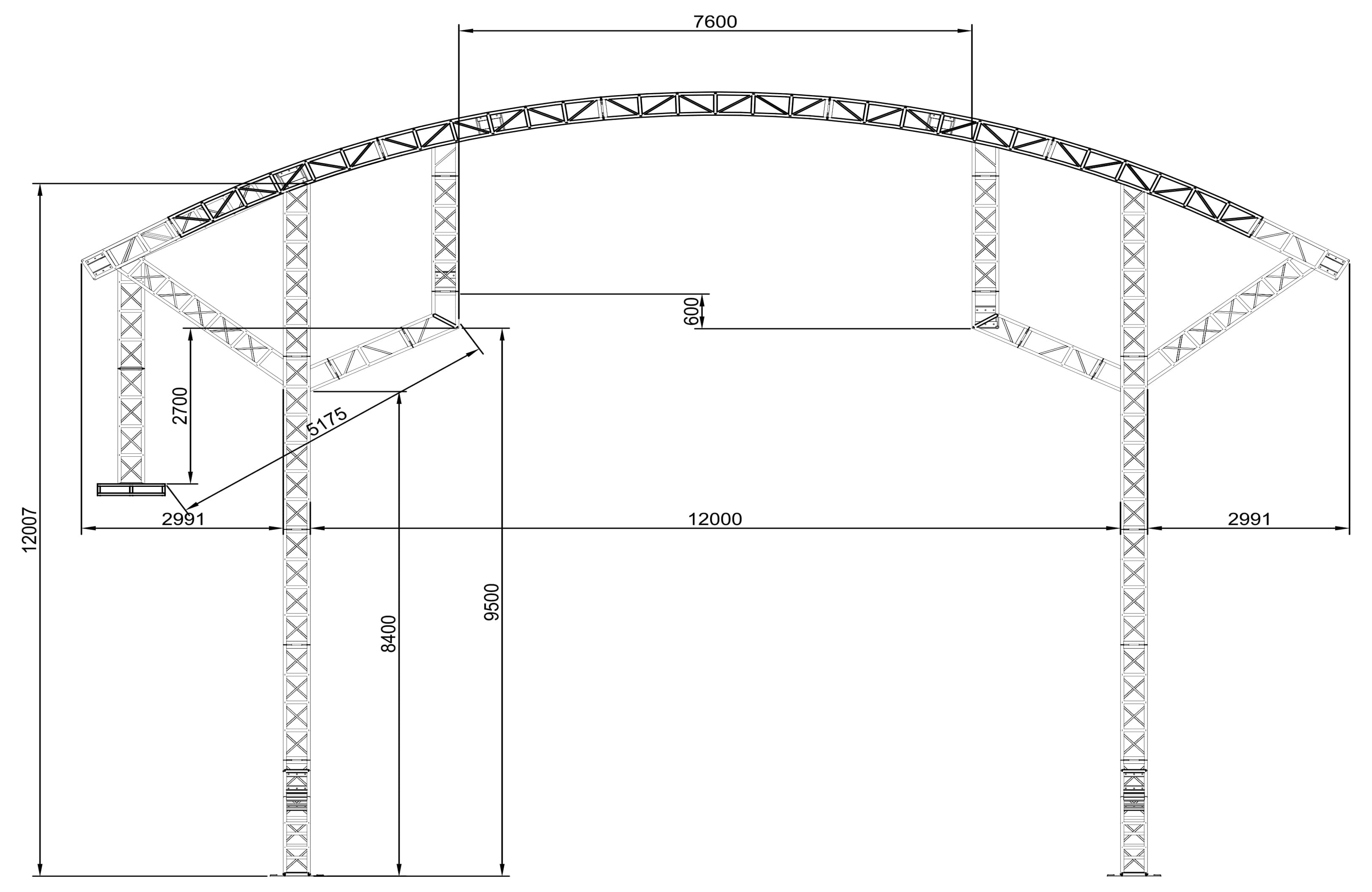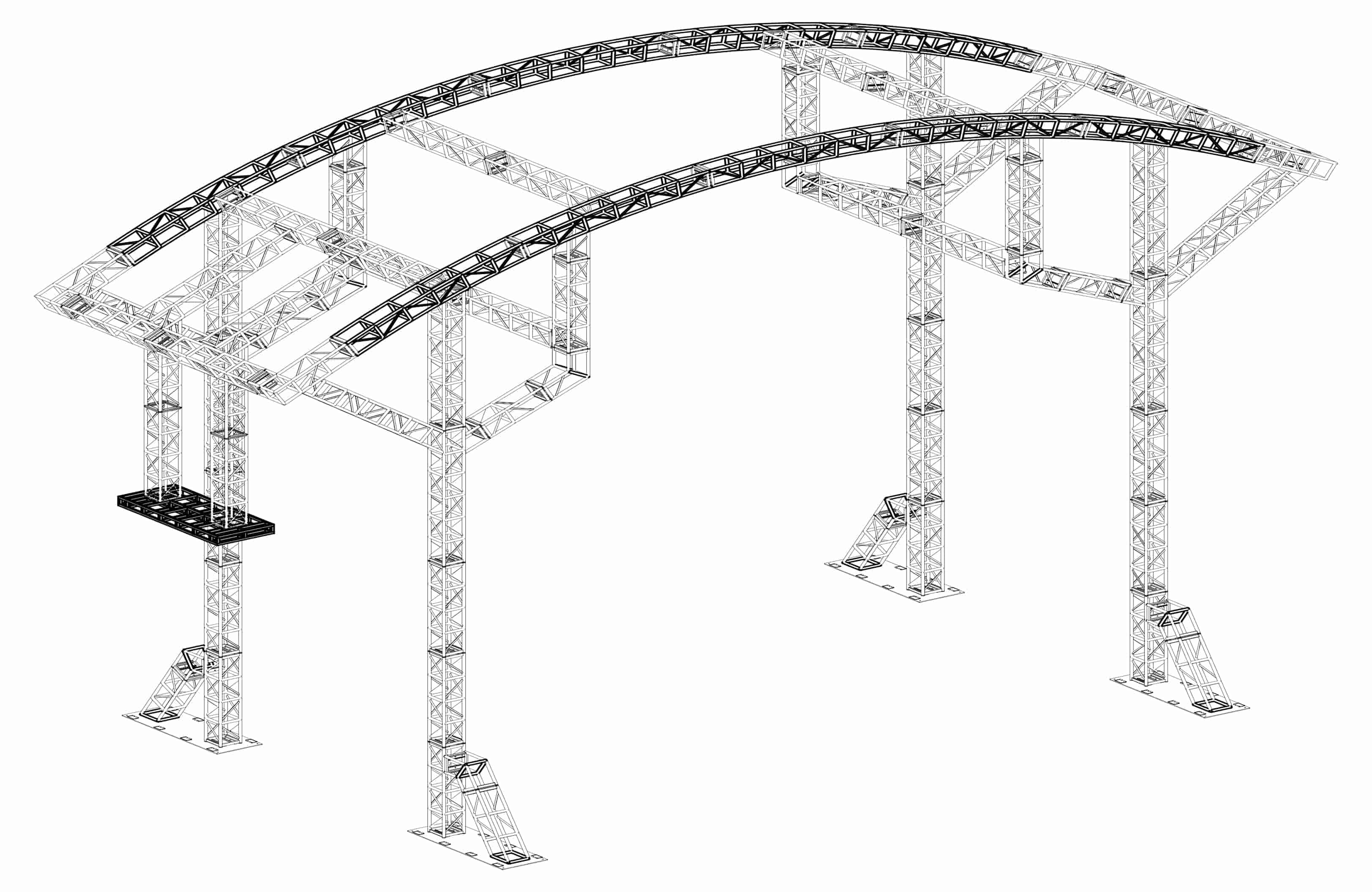هذا الهيكل الجمالوني المنحني، بأبعاد 18 مترًا × 5 أمتار × 12 مترًا، مُصمم خصيصًا للعروض البهلوانية. وفقًا لمتطلبات العميل، يجب أن يكون الجانب الأيسر من الهيكل أعلى من الجانب الأيمن بمقدار 60 سم، وأن تكون المسافة بين الأجزاء المعلقة على الجانبين 8 أمتار.